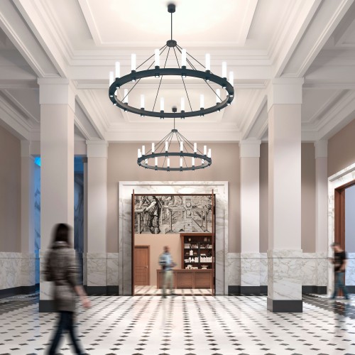 Rosy is an elegant ring pendant with clean lines, great performance, and plenty of options. Sizes from two- to eight-feet diameter are standard, and the flexible extruded aluminum construction allows custom sizes and shapes only limited by your imagination. Highly efficient LEDs provide ample uplight, as well as optional downlights recessed into a machined bezel to minimize glare. The dimmable constant current drivers are concealed in the ring structure yet are easily accessible for maintenance. Rosy is supported by a single stem mounting with lower satellite support rods (number depends on size specified).